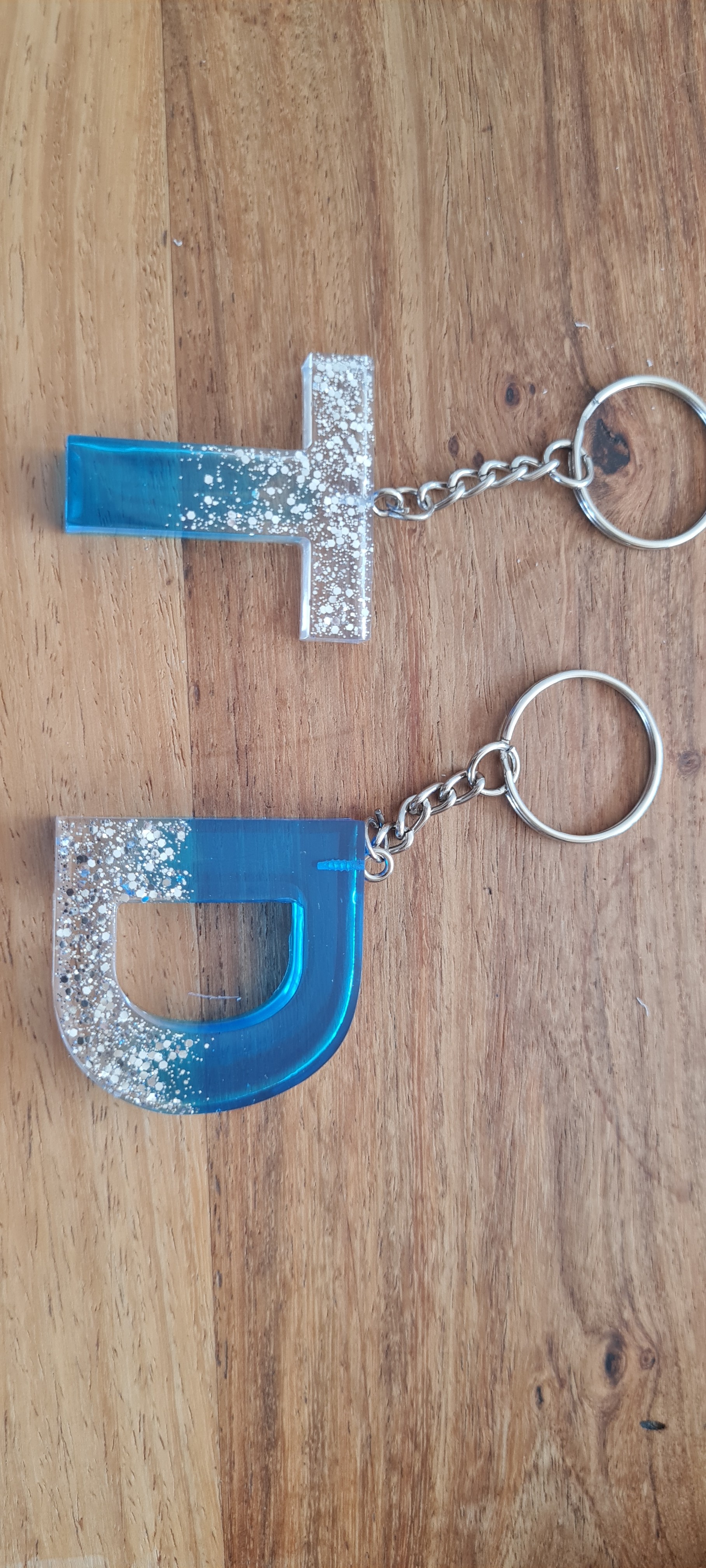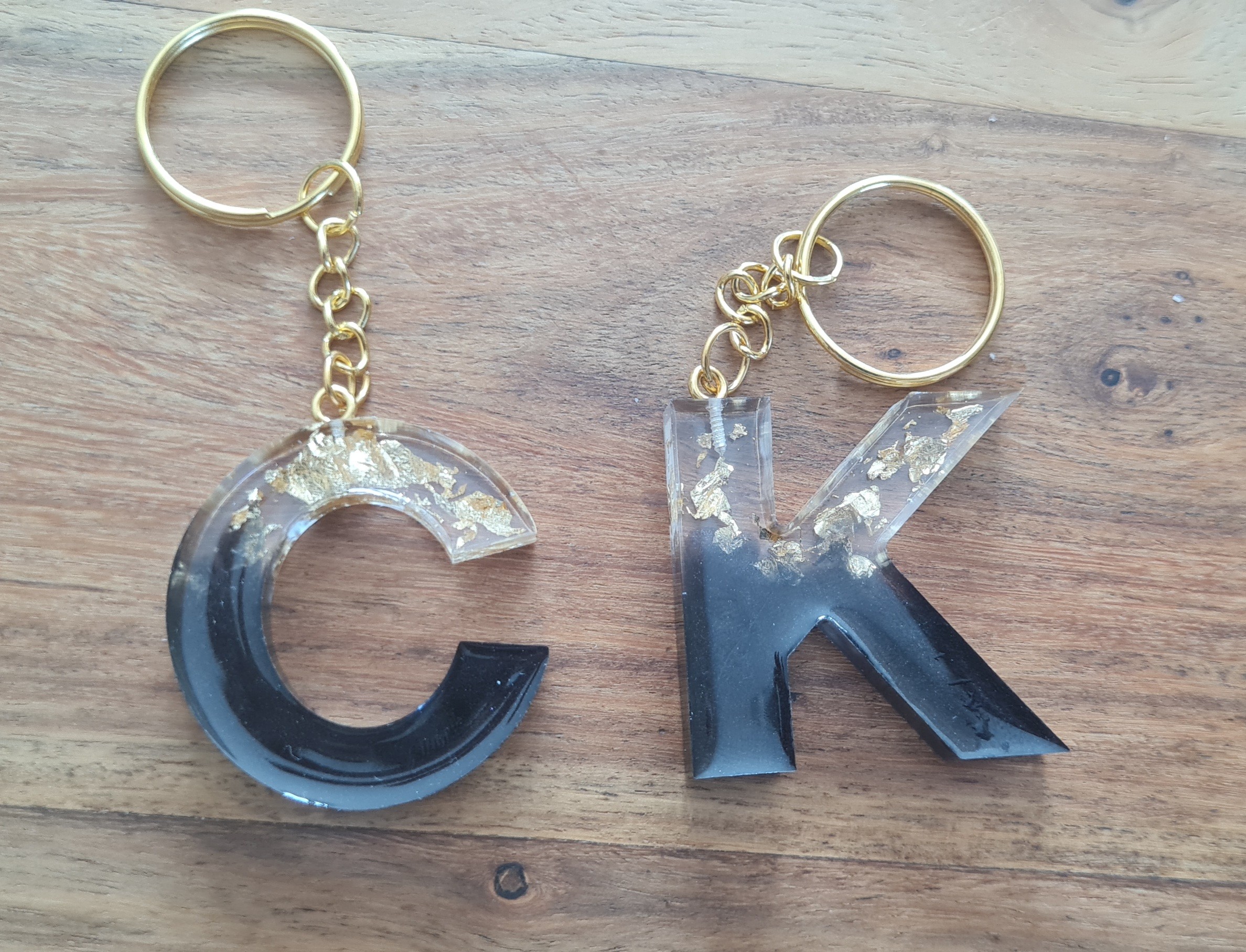 Porte clé alphabet en résine epoxy, existe en plusieurs couleurs : rose-doré, noir-doré ou bleu-argenté